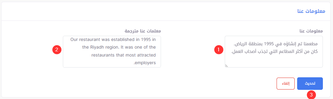 معظم المطاعم لديها سيرة ذاتية مرتبطة بالعلامة التجارية وتكون جاذبة لأعين عملائها، لقطة الشاشة أدناه توضح أين سيكون إنعكاس السيرة الذاتية على المنيو الالكتروني. a screenshot is loading ... الخطوات لاضافة السيرة الذاتية عن المطعم: 1) إذهب إلى الإعدادات ...