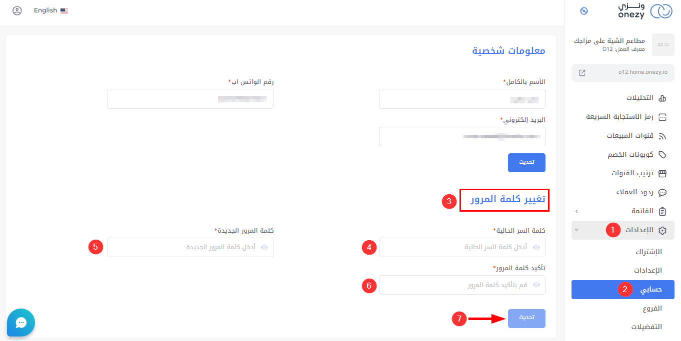 في بعض الأحيان نحتاج لتغيير المعلومات الشخصية في لوحة التحكم الخاصة بمدير الحساب للمطعم أو المتجر مثل الاسم بالكامل ورقم الواتساب البريد الالكتروني. ونزي - Onezy يساعدنا في إجراء هذه العملية كالتالي: 1) اذهب إلى الاعدادات 2) اختر حسابي 3) ستظهر ...